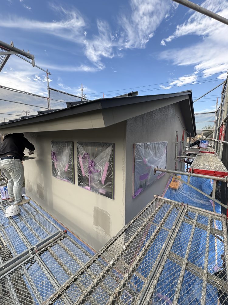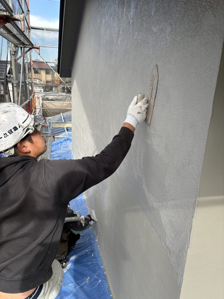 外壁モルタル下地に塗り壁仕上げが始まりました。