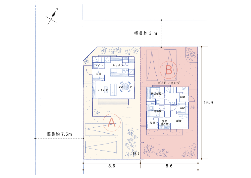 「ふたつのいえ」と名付けたいえのわのモデルプランでは、