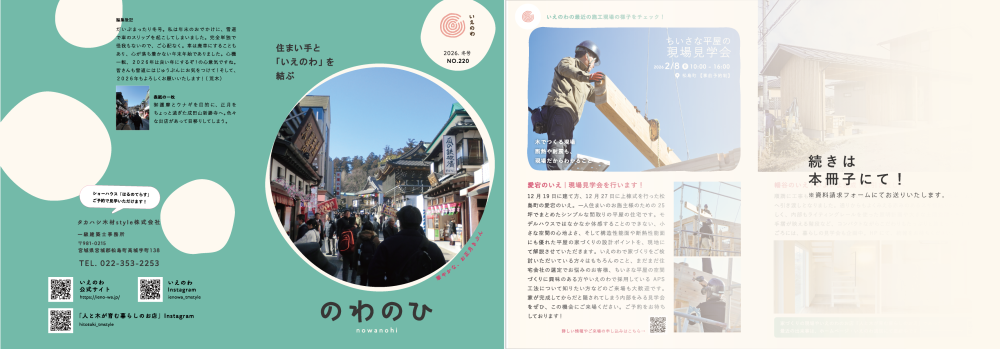 年4回ほど発行しているのわのひですが、日々の建築現場のことや今後の見学会などのイベント情報、いえのわのお店「人と木が育む暮らしのお店」の情報までたっぷり詰めた8P冊子の情報誌です。