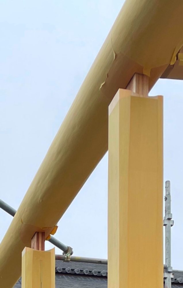 丸太の自然な曲がりを活かしつつ他の木材と強固に結合するのですが