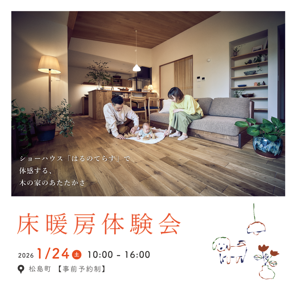 いえのわのショーハウス「はるのてらす」を見学し、木の家づくりと床暖システムによる快適なあたたかさを体感することができます。