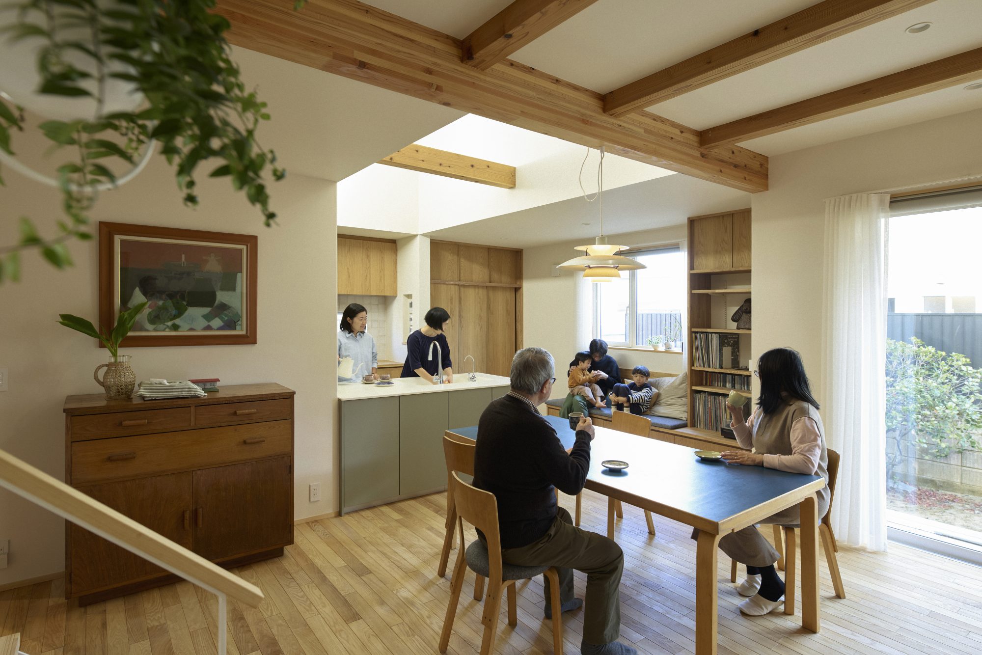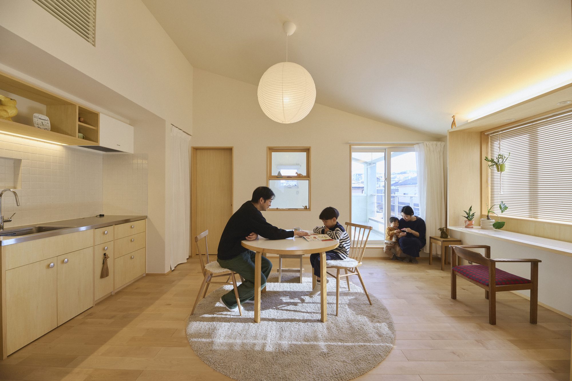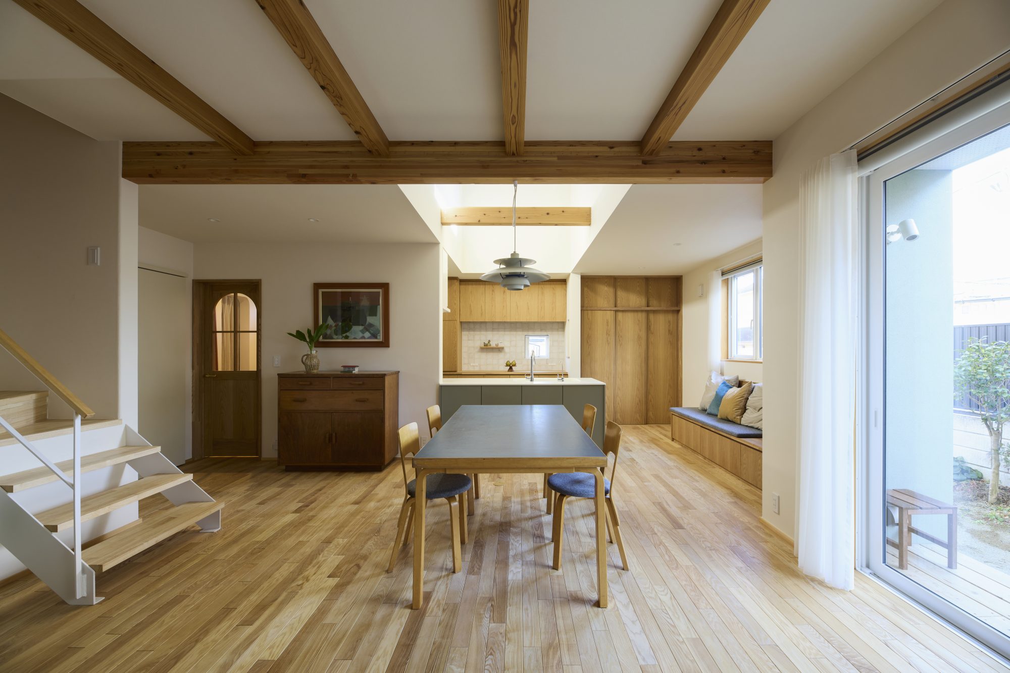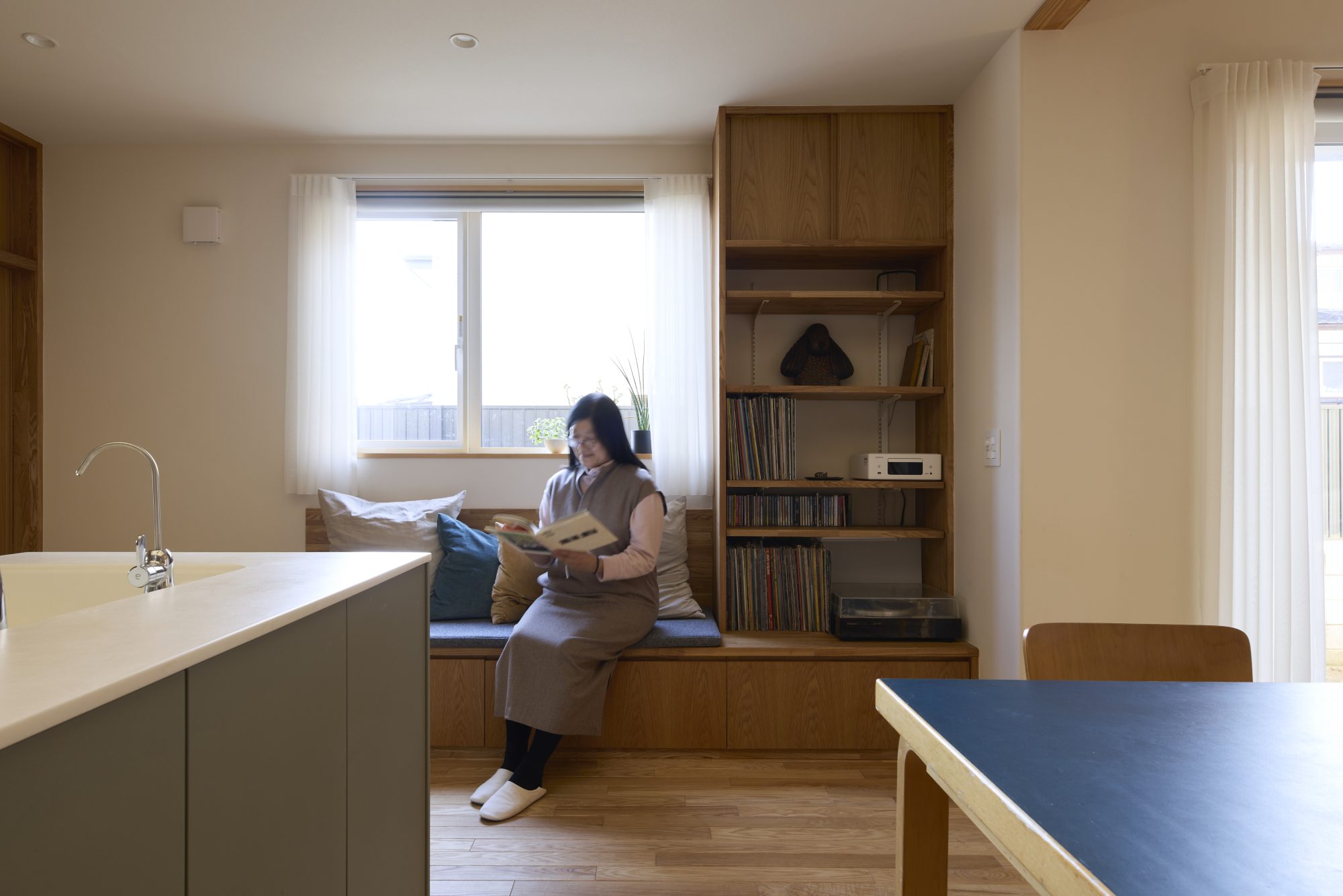無垢材のフローリング、吹き抜けにつながる木製窓、キッチンと洗面にはタイルを貼って、窓際にはたっぷりの造作家具。