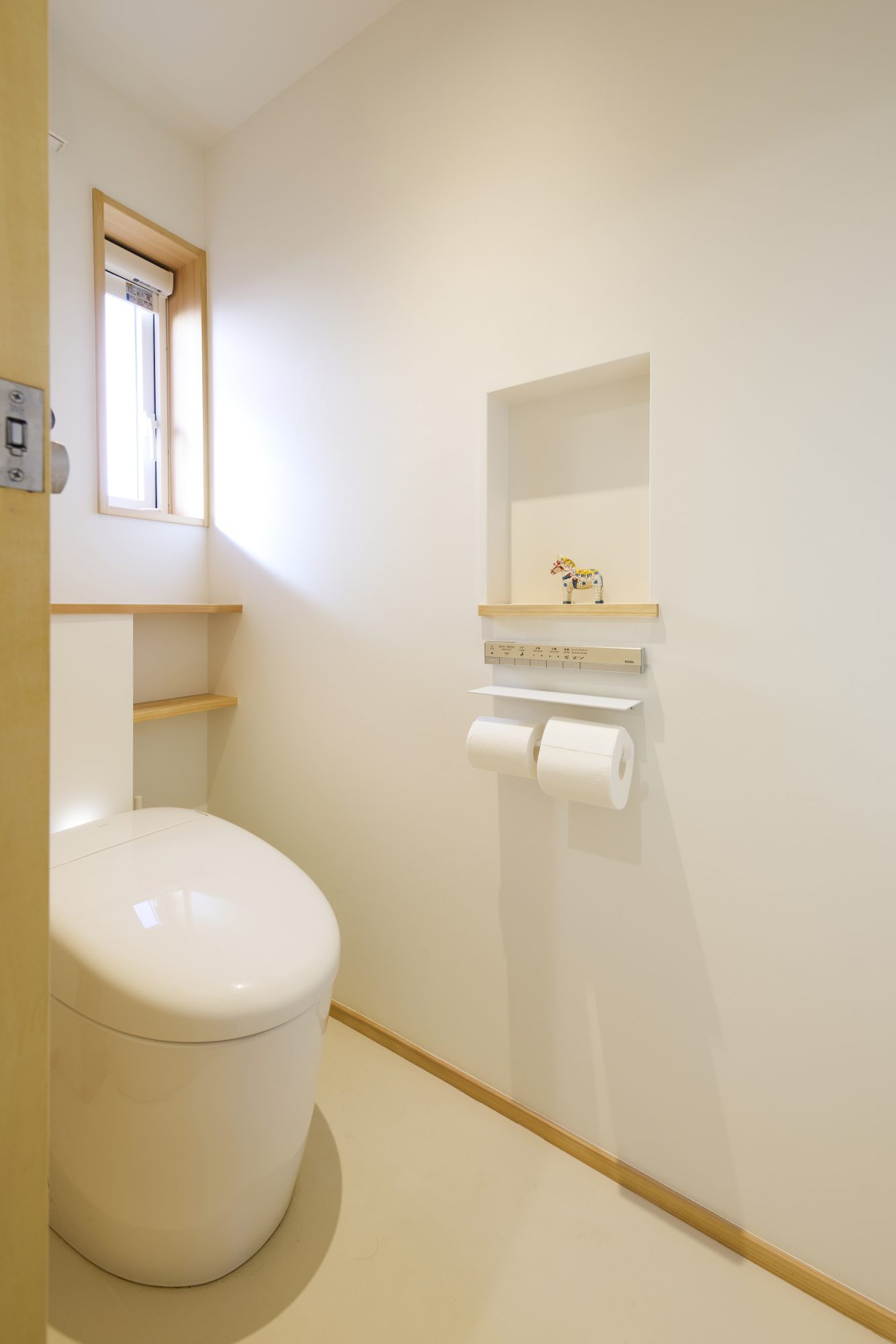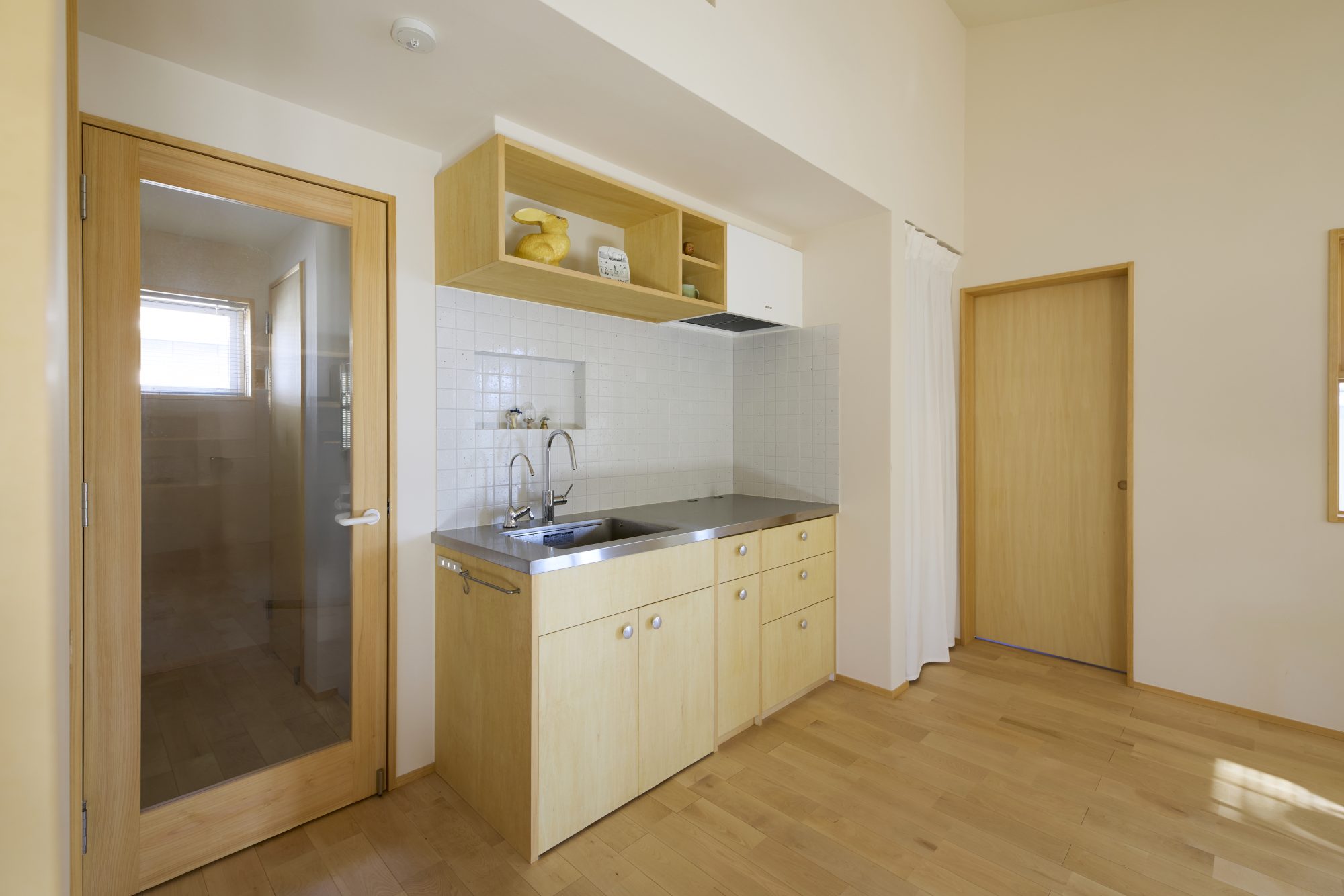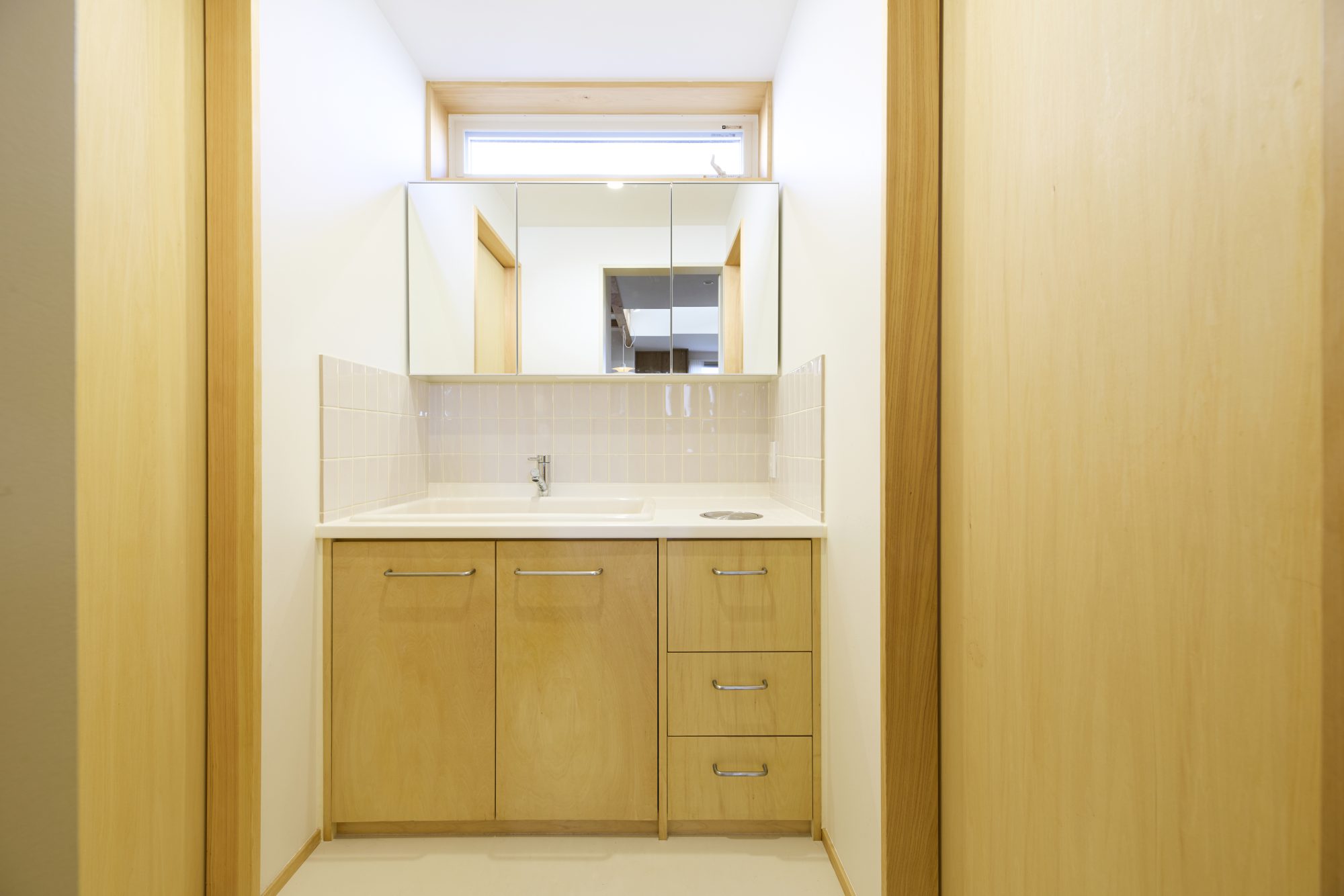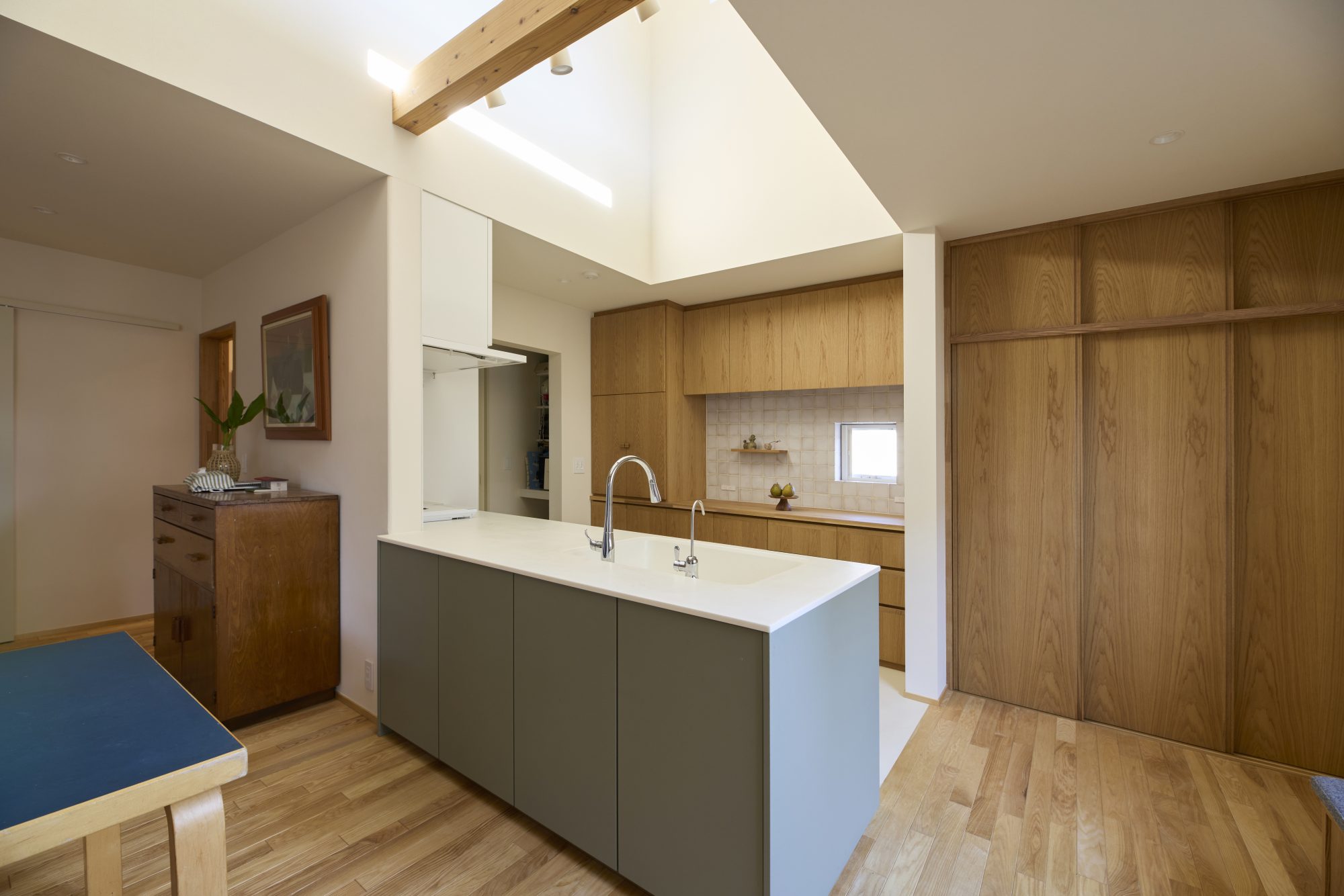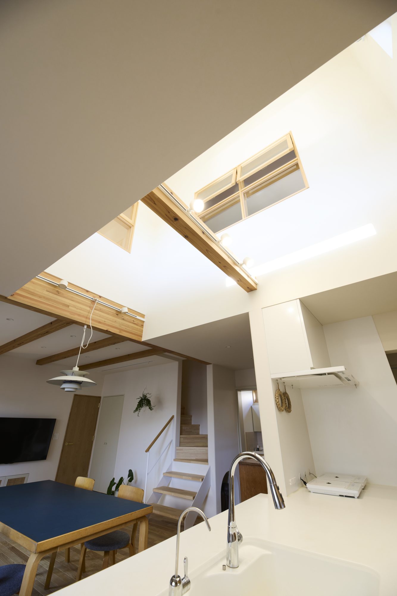 無垢材のフローリング、吹き抜けにつながる木製窓、キッチンと洗面にはタイルを貼って、窓際にはたっぷりの造作家具。