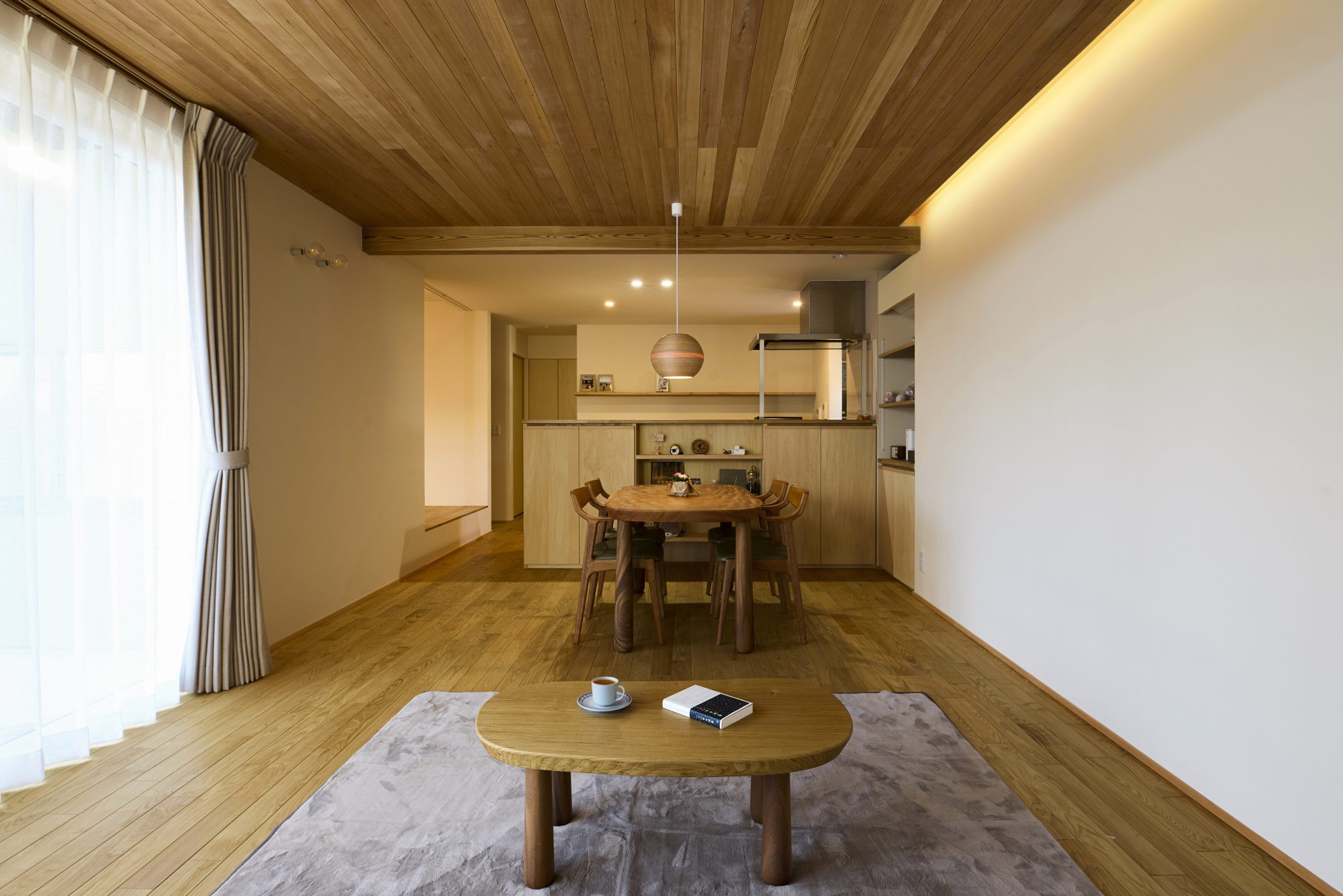 奥行のあるリビングダイニングには、壁にあてるように仕込んだ間接照明の光がやさしく降り注ぐように。